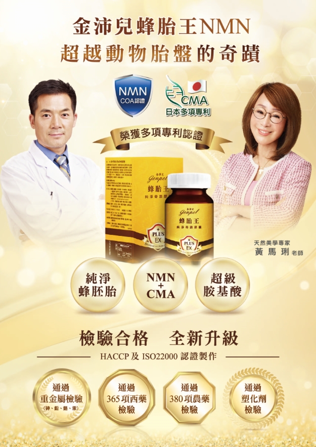 金沛兒為愛美女性推出全新升級版配方。擁有超過20年的好口碑的金沛兒,採用經過COA認證的β‐NMN與日本專利CMA成分,同時加入高蛋白雄蜂子、青春女王蜂子與燕窩萃取物等精華成分,高品質的保養設計獲得消費者肯定!
